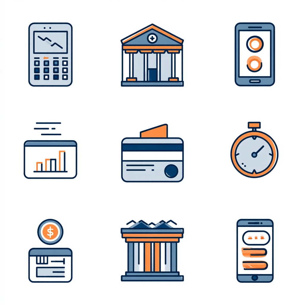 set of 9 flat vector icons for fintech app, blue and orange color scheme, consistent stroke and corner radius, professional style --style raw