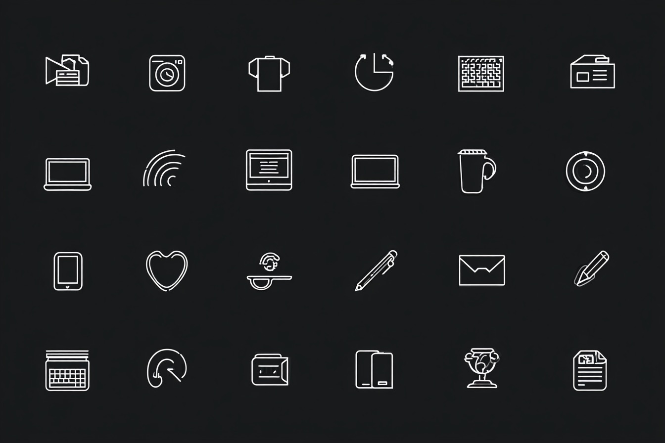 simple monochrome line icons, consistent stroke, minimal UI aesthetic, designed for dark mode interface --ar 3:2 --style raw