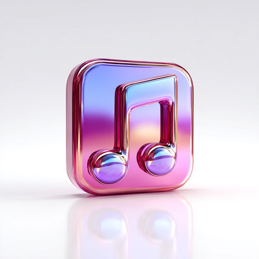 3D glossy app icon of music note, vibrant reflection, floating on white background, soft ambient light --style raw